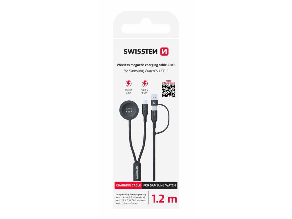Magnetický kabel Swissten 2v1, Pro Samsung Galaxy Watch 1–7 + Ultra, Výkon USB-C: až 60 W, Výkon pro hodinky: 2,5 W, Délka: 1,2 m, Váha: 42 g, Silikonové provedení. Baleno v blistru Swissten.