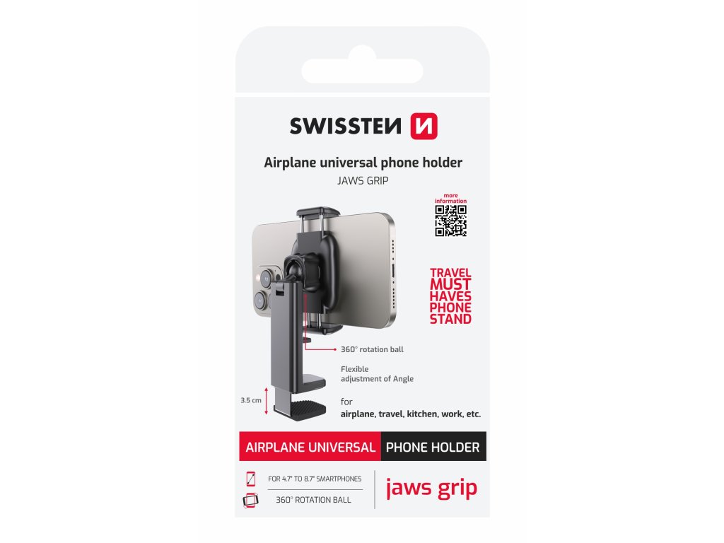 Univerzální čelisťový držák SWISSTEN, Max. tloušťka uchycení: 35 mm, Max. rozpětí čelisti: 105 mm, Pro telefony 4,7”–8,5”, Váha: 100 g, Rozměry: 10 × 6,7 × 6,5 cm, Měkké silikonové vložky. Baleno v blistru SWISSTEN.