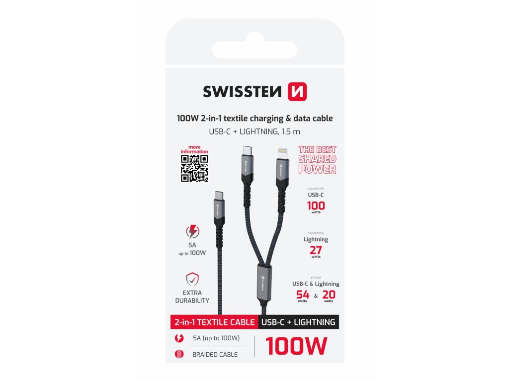 SWISSTEN Nabíjecí kabel 2v1 USB-C / USB-C + Lightning 100 W, 1,5 m, černý