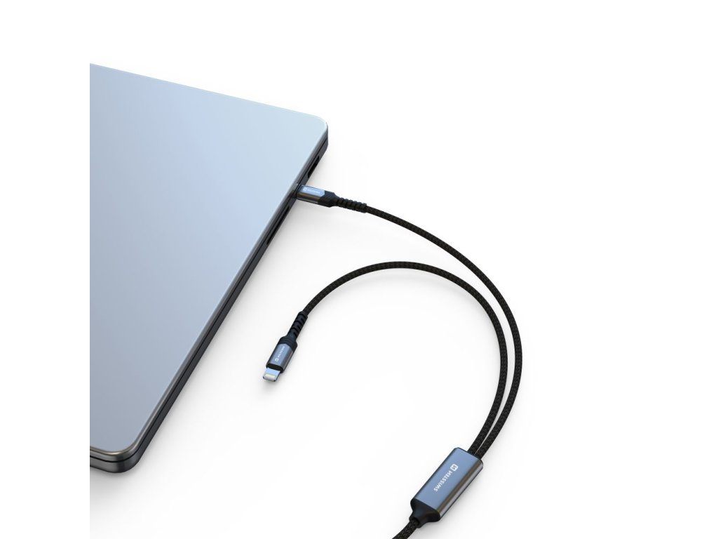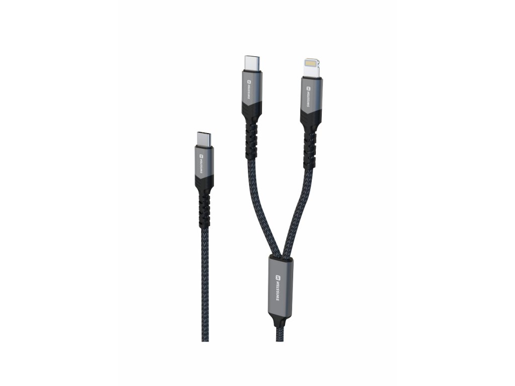 Kabel 2v1 USB-C / USB-C + Lightning 100W, délka 1,5 m. Všechno pěkně v blistru SWISSTEN.