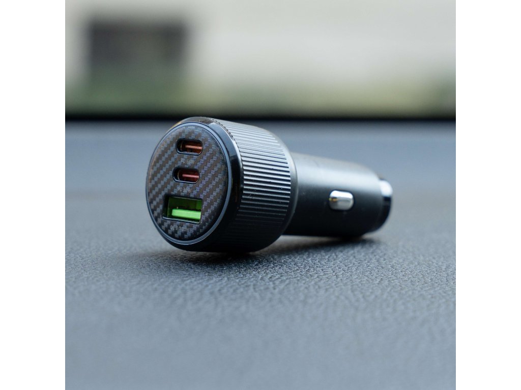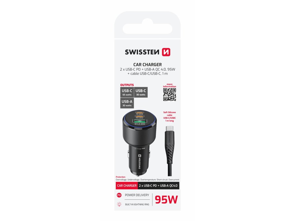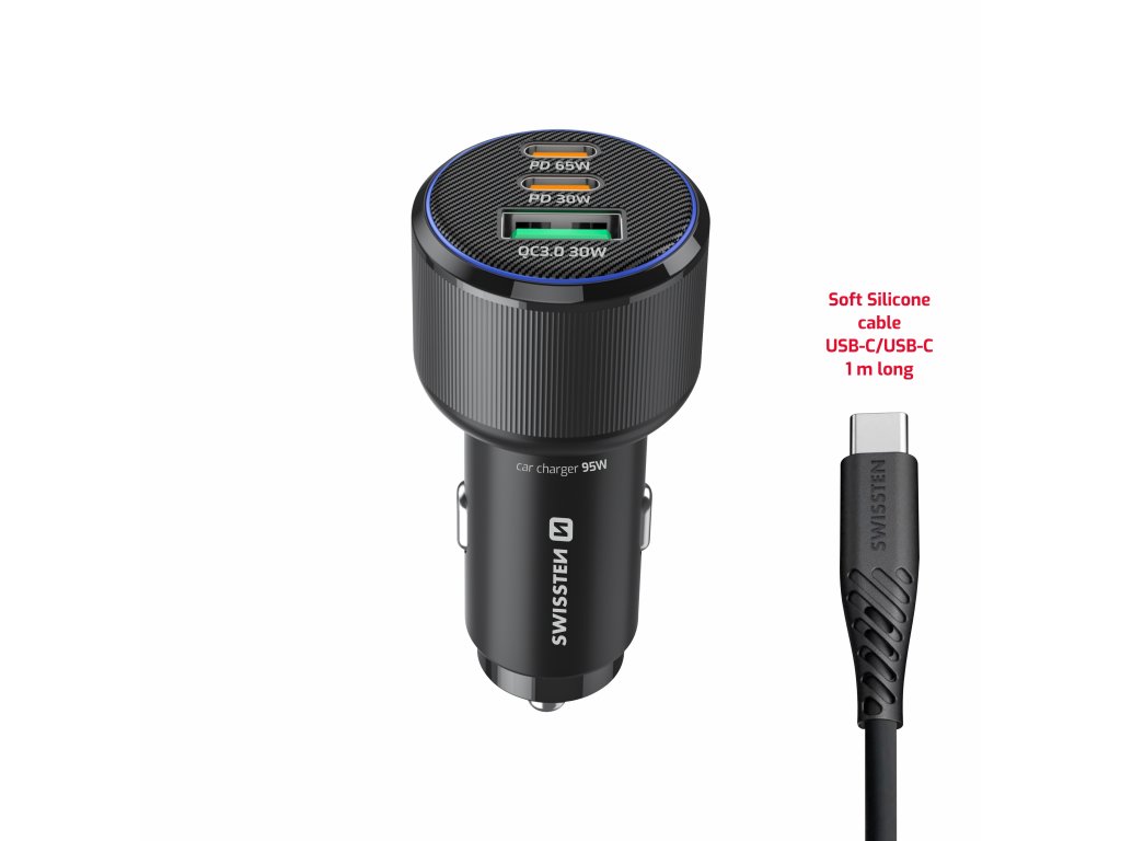 Autonabíječka Swissten 95W s USB-C kabelem, Porty: 2× USB-C + USB-A, Max. výkon USB-C1: 65W, Max. výkon USB-C2: 30W, Max. výkon USB-A: 30W, Vhodná pro notebooky, Modré LED světlo, Váha: 30 g, Rozměry: Průměr 3,25 × 7,39 cm. Baleno v blistru Swissten.