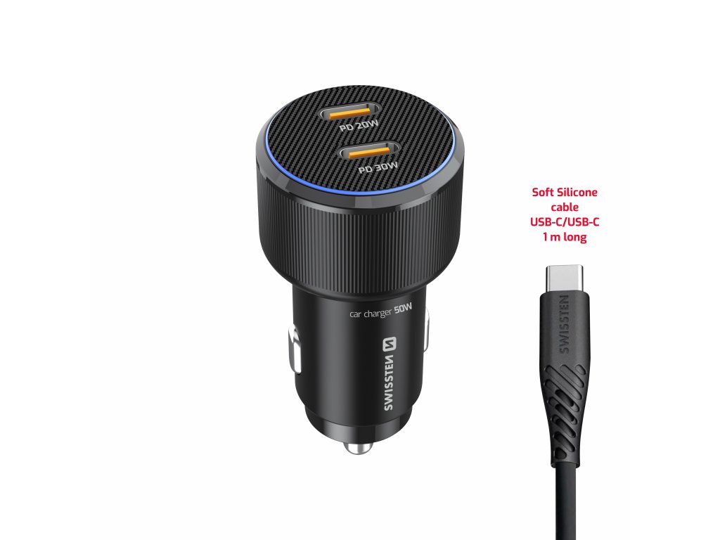 Autonabíječka Swissten 50W s kabelem, Porty: 2× USB-C, Max. výkon USB-C1: 20W, Max. výkon USB-C2: 30W, Kabel: USB-C/USB-C 1 m 60W, Modré LED světlo, Váha: 26 g, Rozměry: Průměr 3,08 × 6,43 cm. Baleno v blistru Swissten.