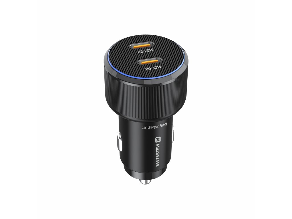 Autonabíječka Swissten 50W, Porty: 2× USB-C, Max. výkon USB-C1: 20W, Max. výkon USB-C2: 30W, Modré LED světlo, Váha: 26 g, Rozměry: Průměr 3,08 × 6,43 cm. Baleno v blistru Swissten.