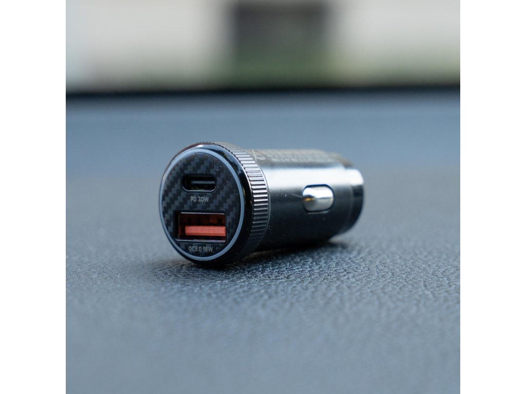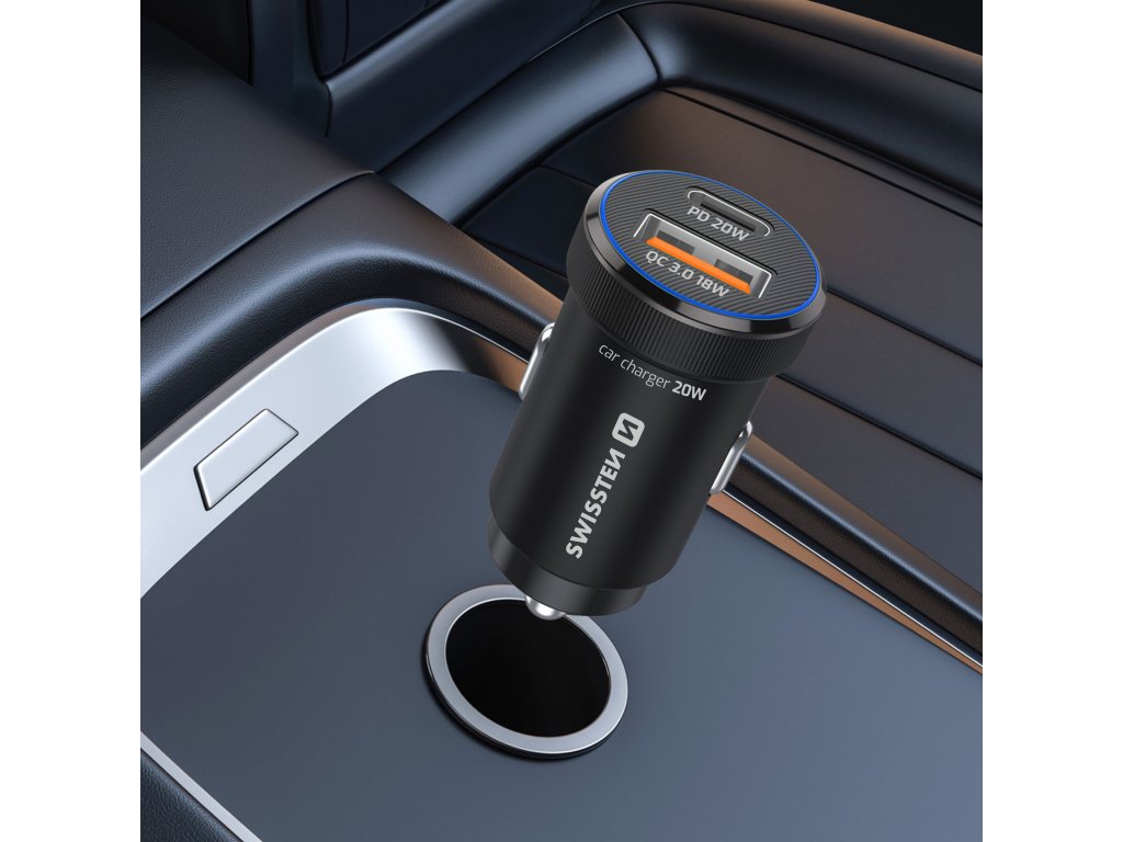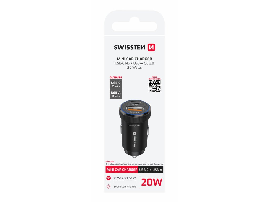 Autonabíječka Swissten 20W, Porty: USB-C + USB-A, Max. výkon USB-C: 20W, Max. výkon USB-A: 18W, Váha: 25 g, Rozměry: Průměr 2,43 × 4,93 cm. Baleno v blistru Swissten.