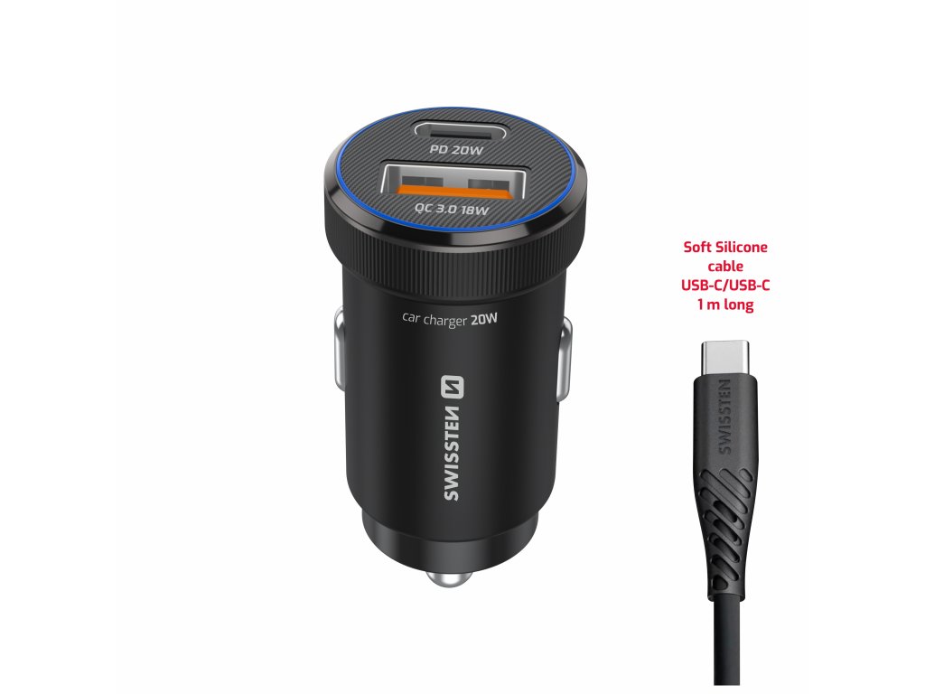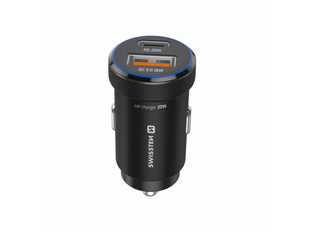 Autonabíječka Swissten 20W, Porty: USB-C + USB-A, Max. výkon USB-C: 20W, Max. výkon USB-A: 18W, Kabel USB-C/USB-C 1m 60W v balení, Váha: 25 g, Rozměry: (2,43 × 2,43 × 4,93 cm). Baleno v blistru Swissten.