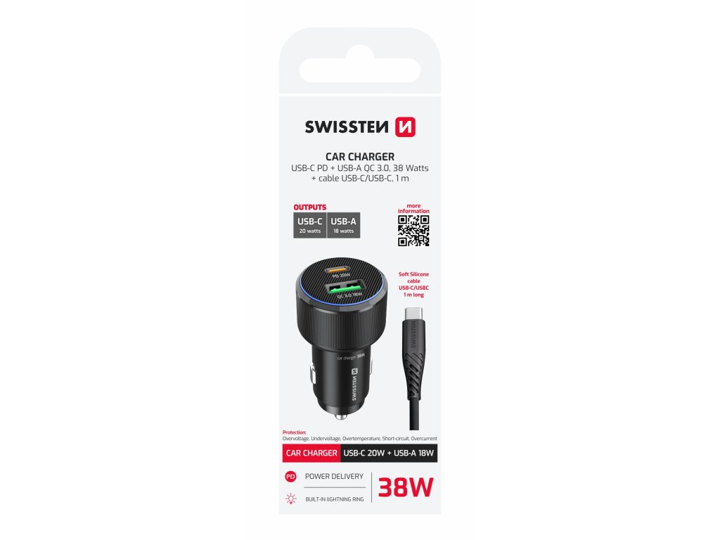Autonabíječka Swissten 38W s kabelem, Porty: USB-C + USB-A, Max. výkon USB-C: 20W, Max. výkon USB-A: 18W, Kabel: USB-C/USB-C 1m 60W, Modré LED světlo, Váha: 26 g, Rozměry: Průměr 3 × 6,43 cm. Baleno v blistru Swissten.