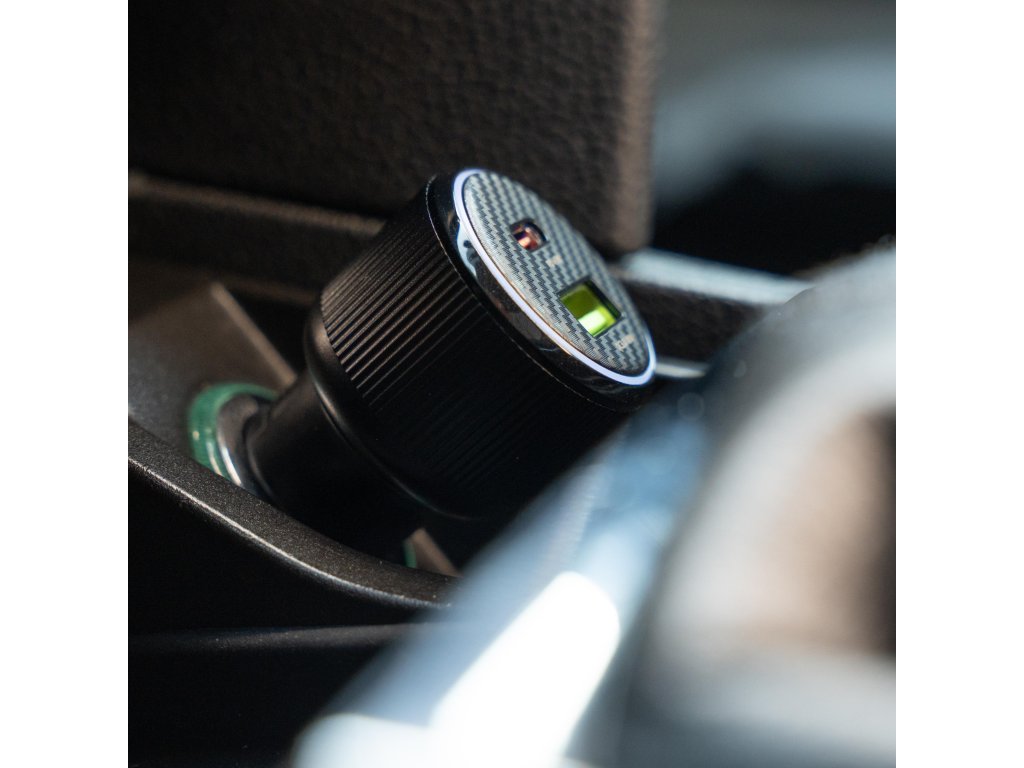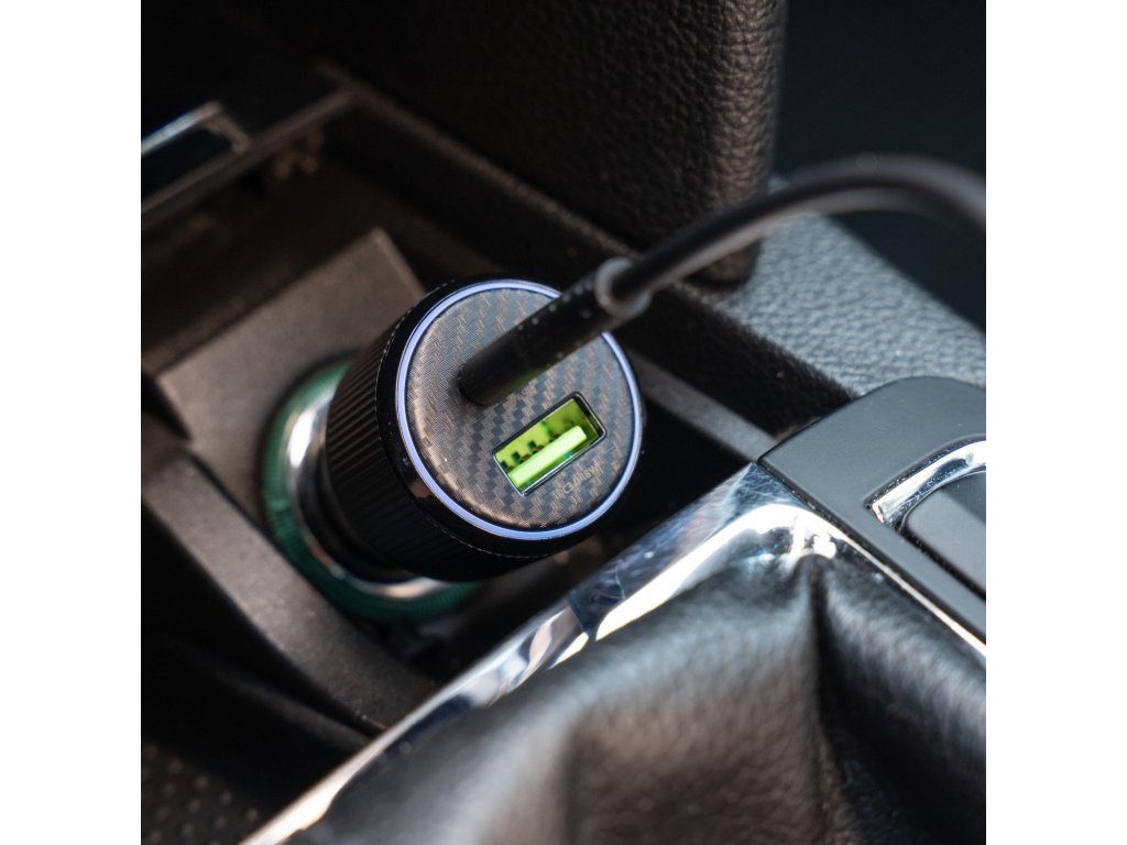 Praktická autonabíječka s podporou rychlého nabíjení PD 3.0 a QC 3.0, vybavená porty USB-C a USB-A. Součástí balení je 1m kabel USB-C/USB-C (3A, 60W, soft silicone) pro okamžité použití. Modré LED osvětlení v obvodu nabíječky usnadňuje připojení kabelu i při jízdě v noci.