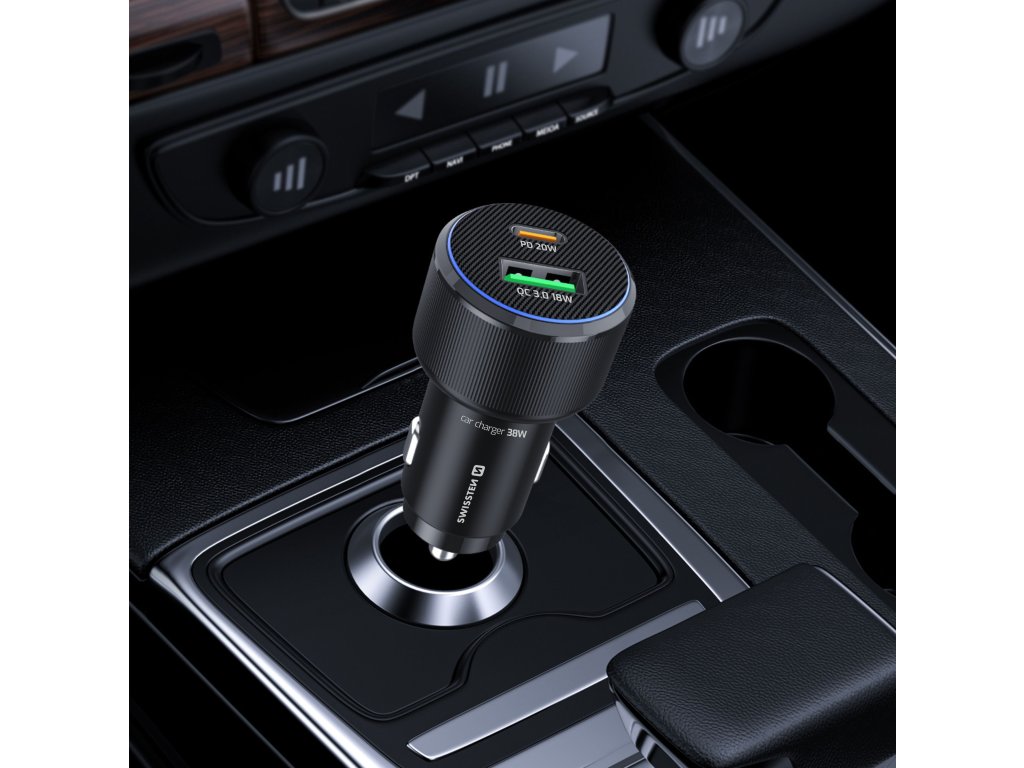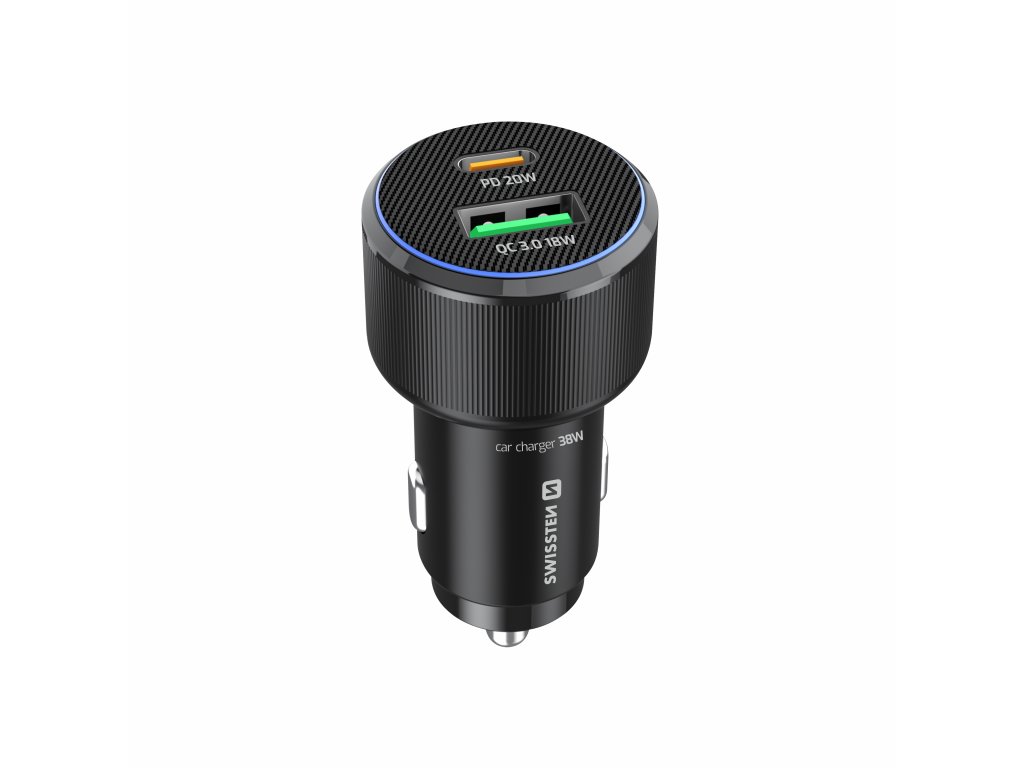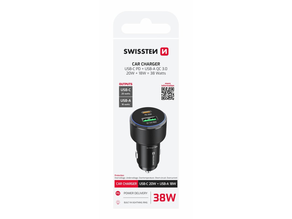 Autonabíječka Swissten 38W, Porty: USB-C + USB-A, Max. výkon USB-C: 20W, Max. výkon USB-A: 18W, Modré LED světlo, Váha: 26 g, Rozměry: Průměr 3,08 × 6,43 cm. Baleno v blistru Swissten.