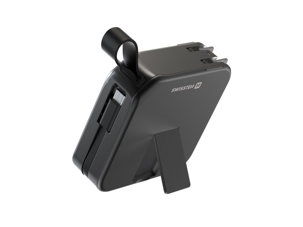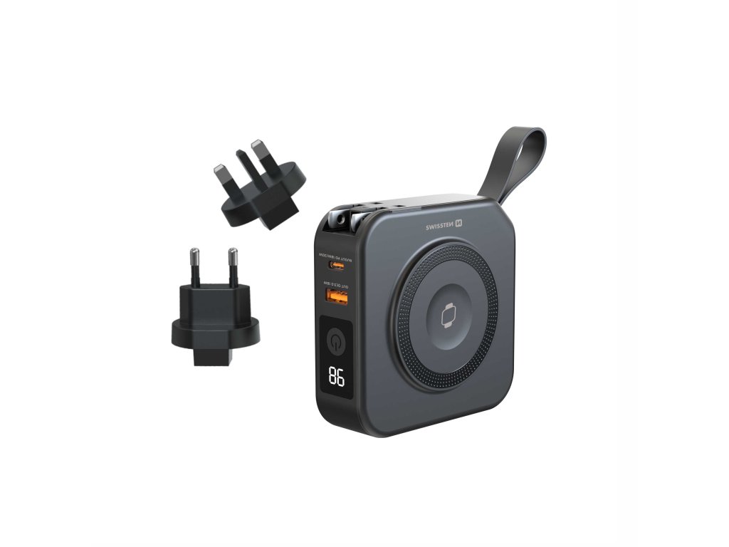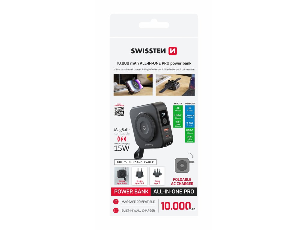 Powerbanka Swissten All-in-One Pro 10 000 mAh, Vyměnitelné vidlice C&E, G, A&B, USB-C PD 20 W, USB-A QC 18 W, MagSafe bezdrátové 15 W, Apple Watch 2,5 W, TWS 5 W, Vestavěný USB-C kabel 12 cm, Pass through charging. Baleno v blistru Swissten.