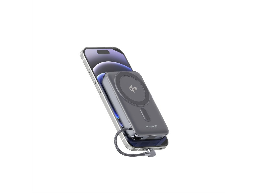 SWISSTEN Powerbanka MagSafe Qi2 15 W, 10000 mAh s integrovaným kabelem USB-C, černá