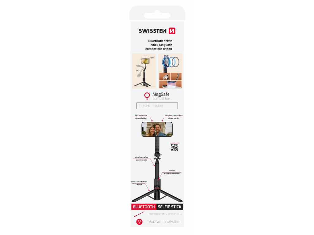 SWISSTEN Bluetooth Selfie Stick Tripod, MagSafe držák, Bluetooth 5.2, Dálkový ovladač 10 m, Délka 21–105 cm, 7 sekcí, Váha 180 g, Stativ s protiskluzovými nožkami. Baleno v blistru Swissten.