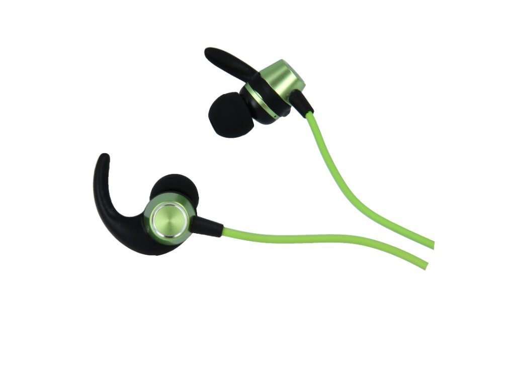 - Bezdrátová sluchátka s propojujícím kabelem za krk určená pro sportovce.