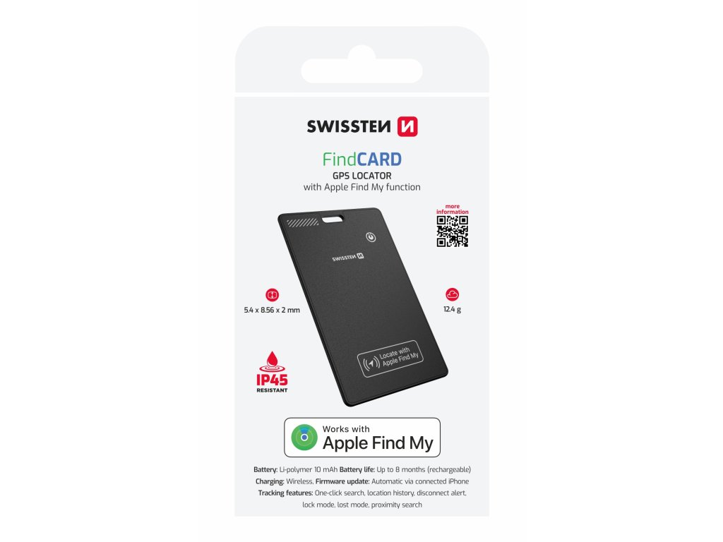 SWISSTEN Find Card, Chytrý lokátor v kreditní kartě s funkcí Apple Find My, IP45 odolnost, Výdrž až 8 měsíců, Vestavěný bzučák, Dobíjení bezdrátově, Do peněženky či dokladovky. Baleno v blistru SWISSTEN.