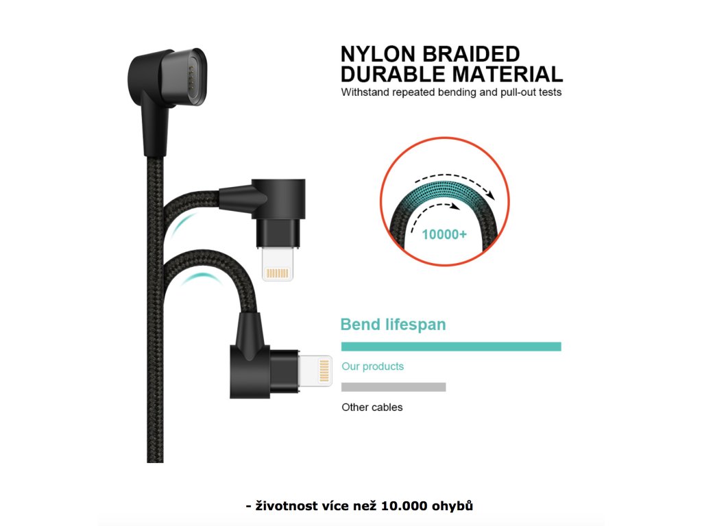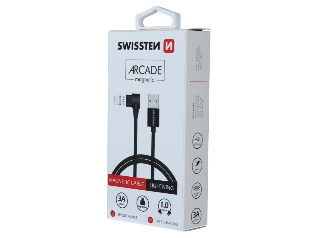 Datový a nabíjecí kabel Swissten Arcade Magnetic je dlouhý 1,2 m a má konektor do L pro pohodlné nabíjení při hraní her nebo sledování videa. Kabel je zesílený a přenese tak větší proud (až 3A) a zvládne i rychlý přenos dat 480 Mb/s. Jednu část koncovky jednoduše necháte v mobilu nebo tabletu, zatímco zbytek stačí přiložit a pomocí magnetu se tak obě části spojí.
