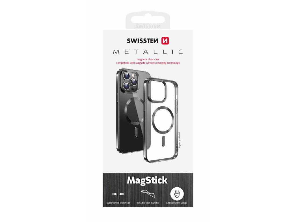 Blistr od SWISSTEN a v něm jedno na první pohled vystajlovaný SWISSTEN metalický pouzdro MagStick pro iPhone s černym rámečkem a kolečkem pro MagSafe nabíjení.
