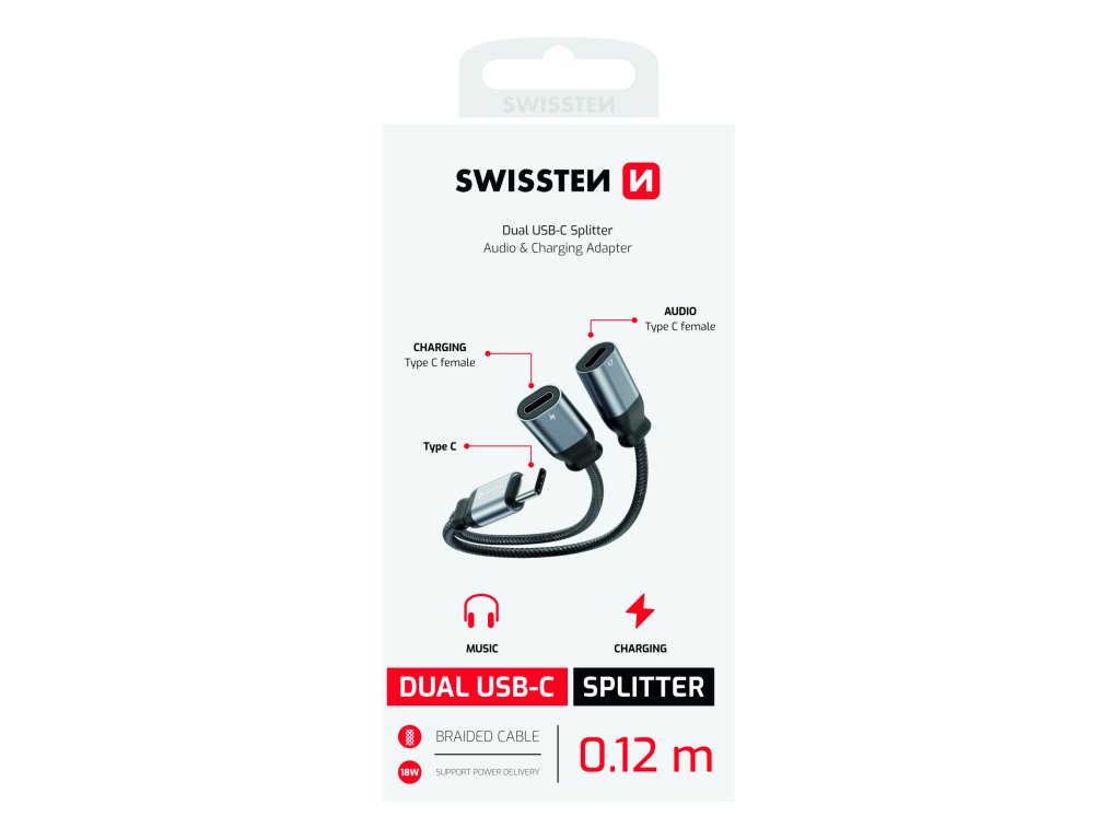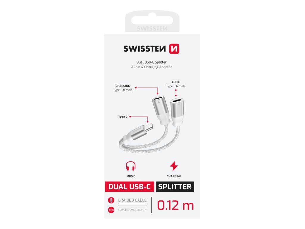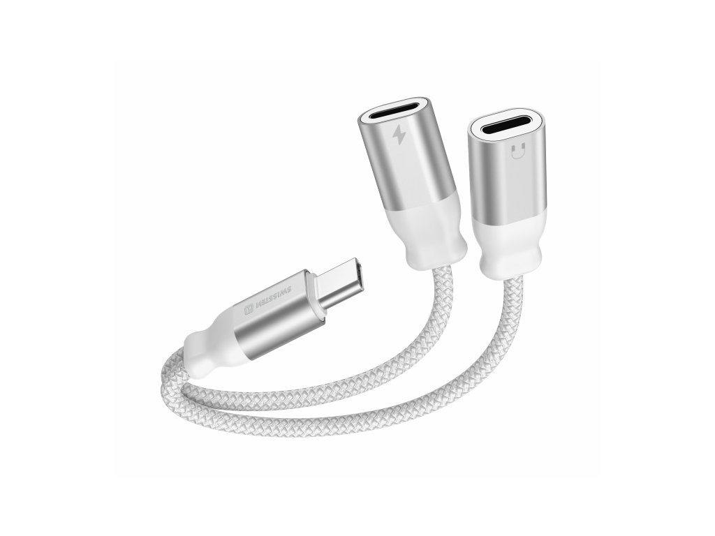 Nabíjecí audio adaptér SWISSTEN Textile USB-C (samec) / 2x USB-C (samice), Délka: 0,12 m, Použití: Slouží pro propojení sluchátek a zároveň připojení dobíjení pomocí konektorů USB-C, Textilní materiál. Baleno v blistru SWISSTEN.