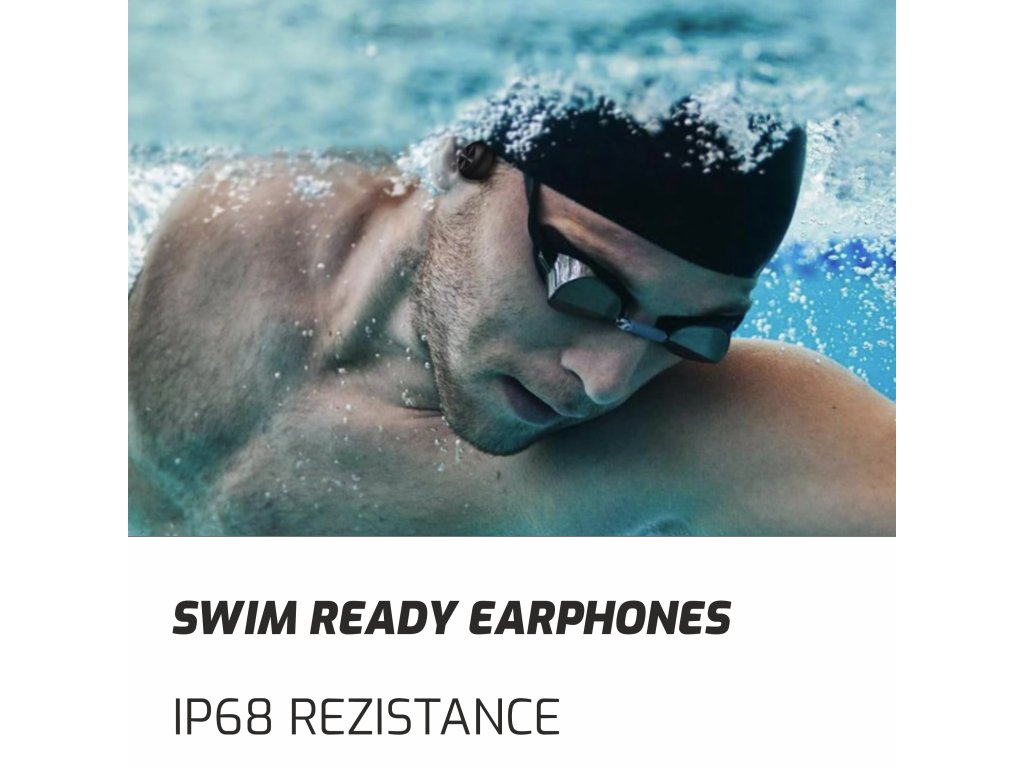 Plná vodotěsnost IP68 Vhodné pro plavání v bazénu i otevřené vodě, odolné proti potu a prachu. Spolehlivě fungují i při dlouhodobém ponoření.