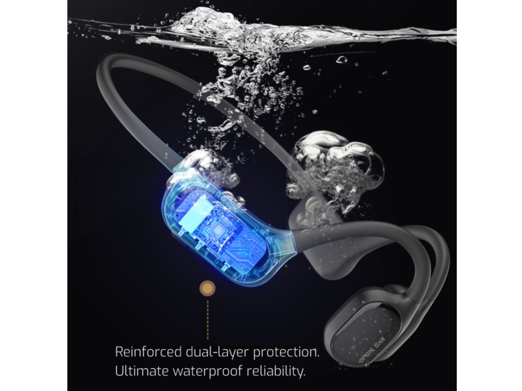 Odolnost IP68 zaručuje plnou ochranu proti vodě i prachu, takže se nemusíte bát ani dlouhého tréninku ve vodě. Prémiový silikonový materiál příjemně sedí, netlačí a odolává potu, chlóru i slané vodě. Velkou výhodou je integrovaná 32GB paměť, do které si díky magnetickému nabíjecímu konektoru snadno nahrajete hudbu přímo z telefonu, a to i bez počítače.